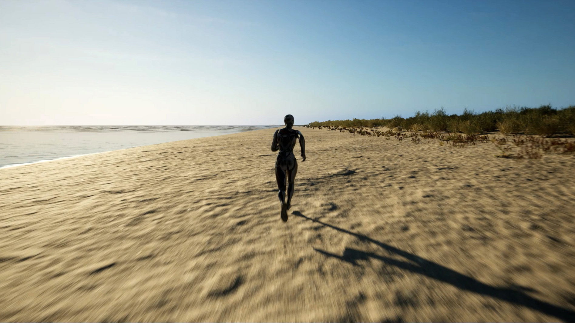 The game character in the video runs along the shore around the island. The horizon line is always at her eye level. One can imagine that she absorbs the space with her gaze or, conversely, projects it around herself.