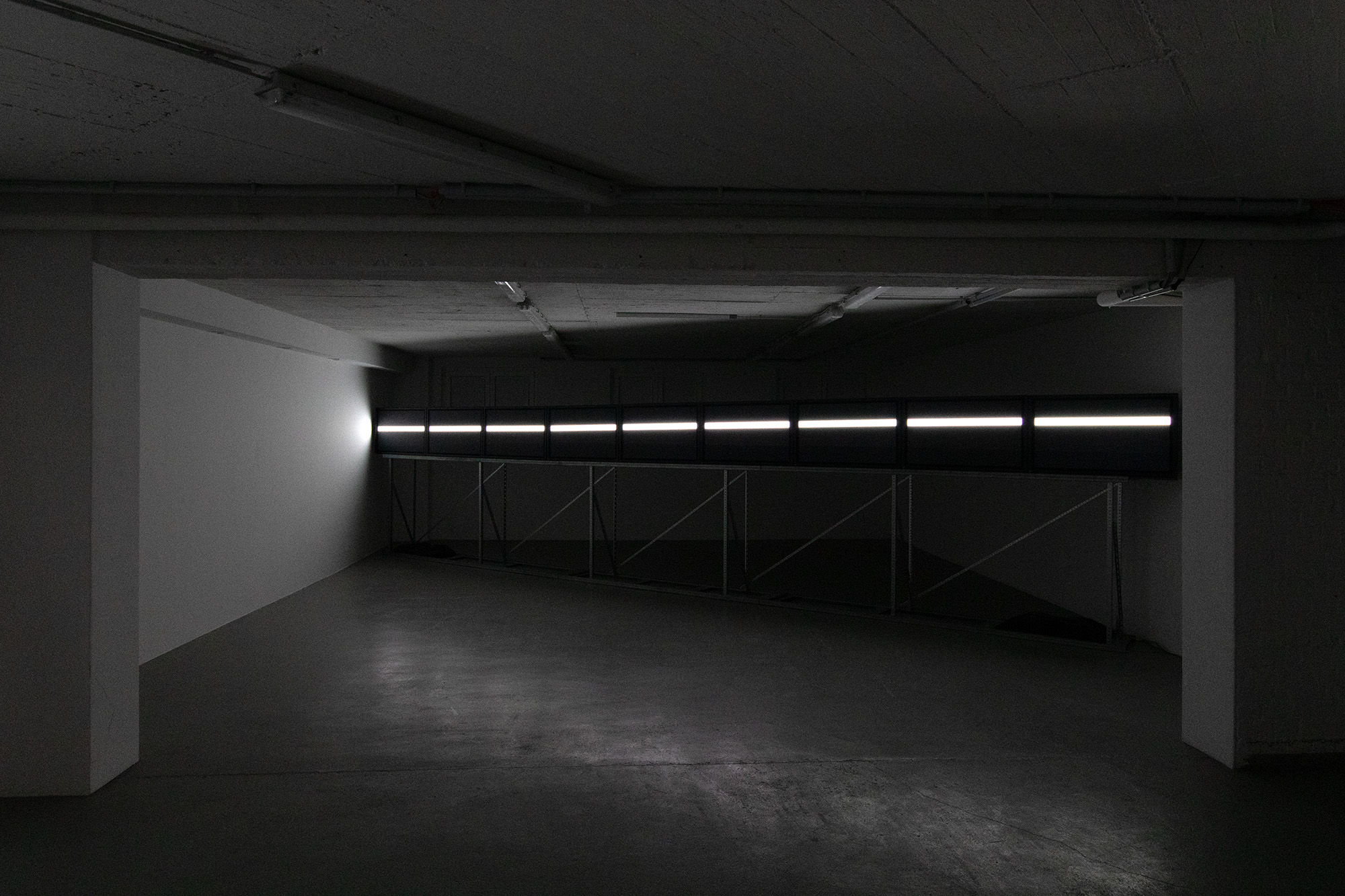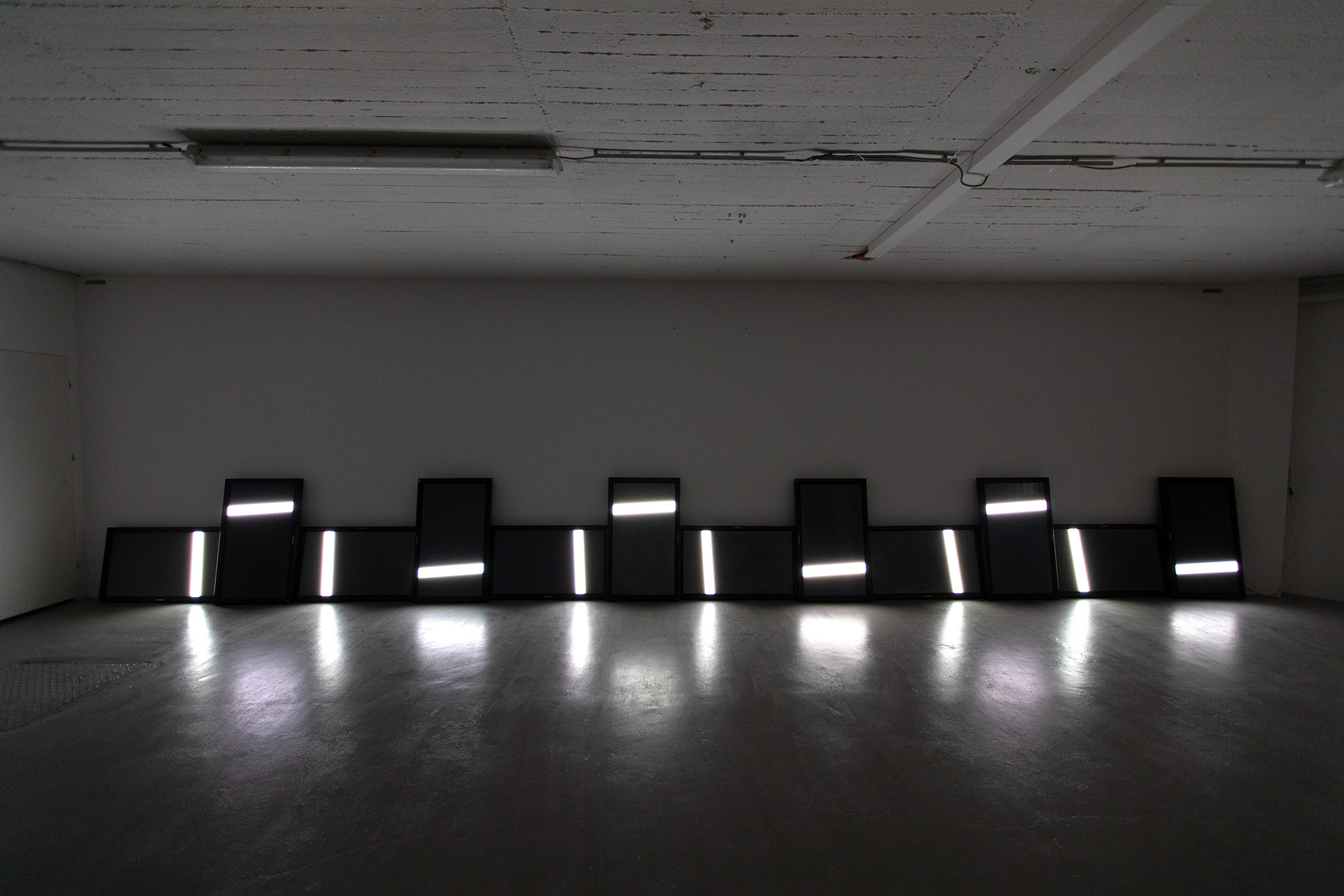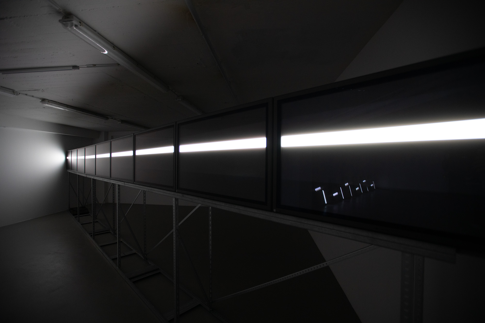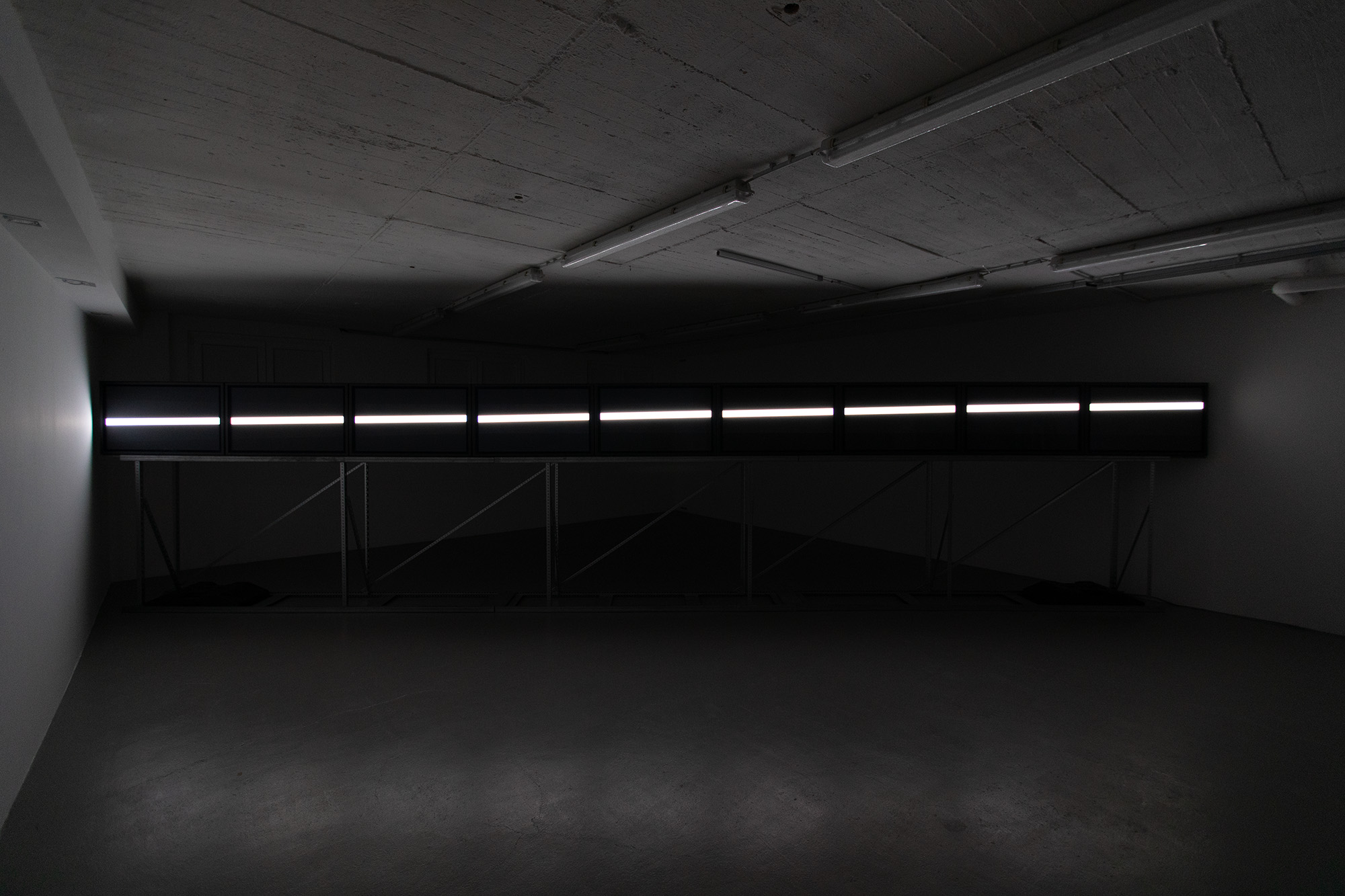 The UPPER EDGE – a line that fluctuates but does not disappear – is the horizon. It is stretched diagonally across the second room, angled towards the main hall, and is made up of nine monitors raised at eye level, showing a nine-channel synchronized video with a white fluctuating band.