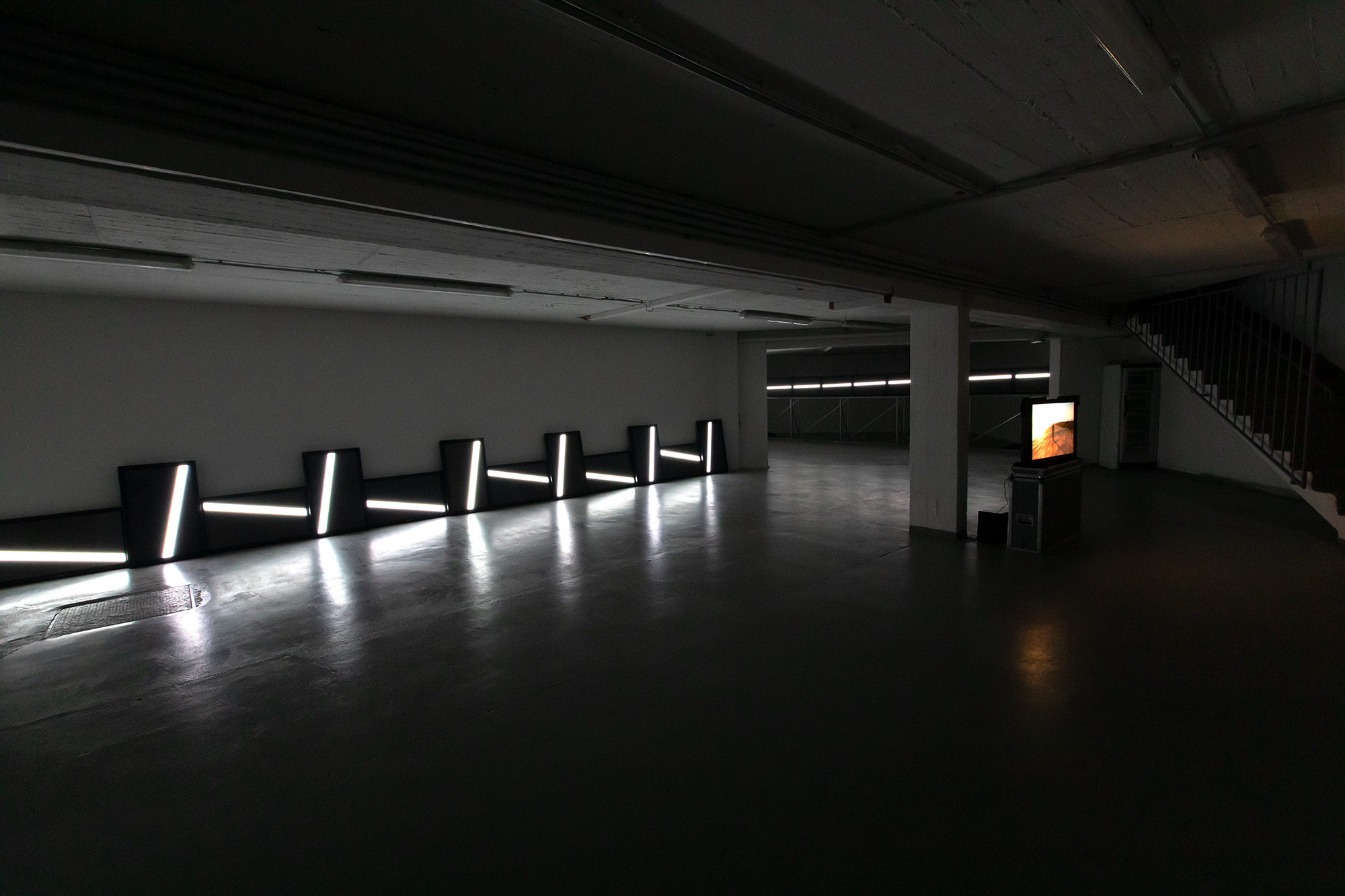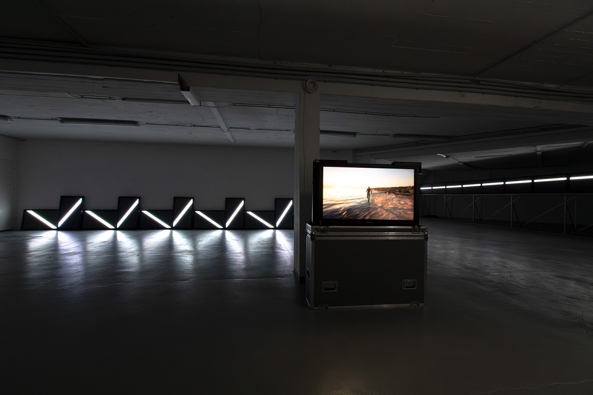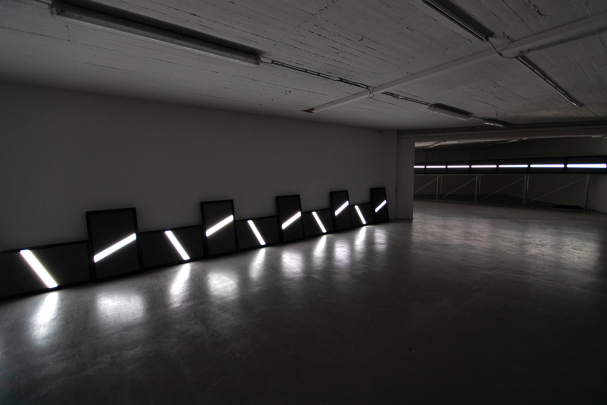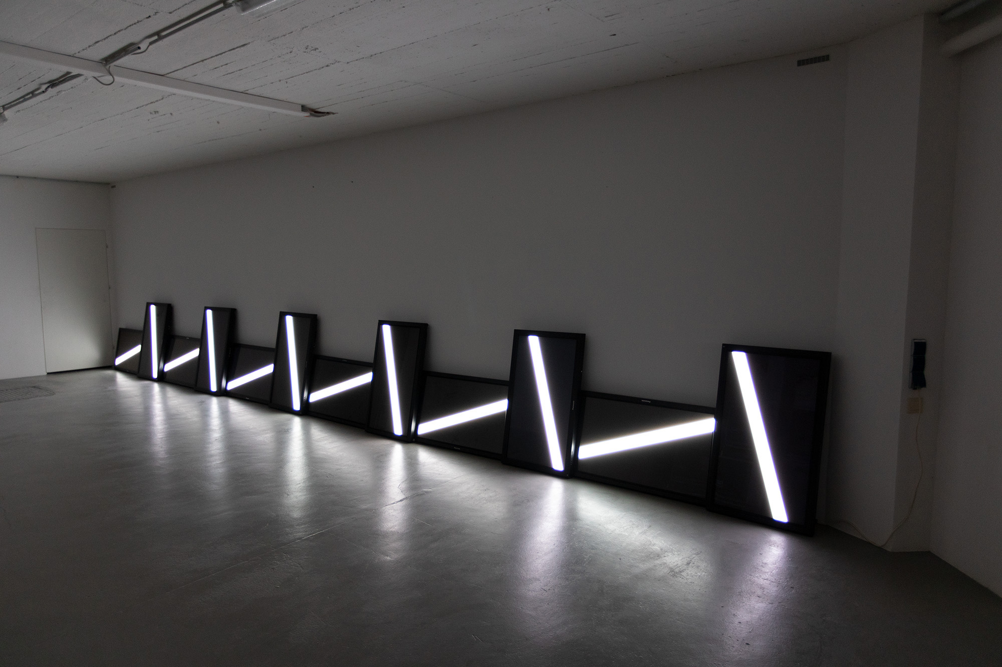The UPPER EDGE – a line that fluctuates but does not disappear – is the horizon. It is stretched diagonally across the second room, angled towards the main hall, and is made up of nine monitors raised at eye level, showing a nine-channel synchronized video with a white fluctuating band.
