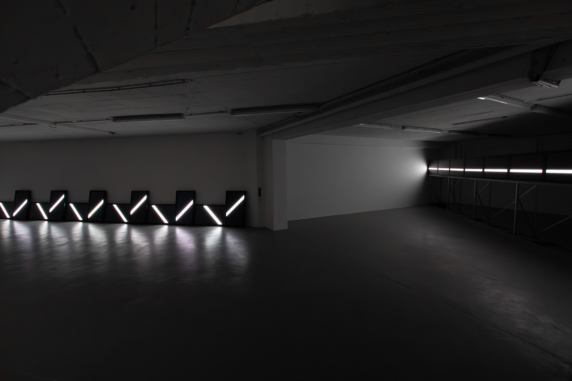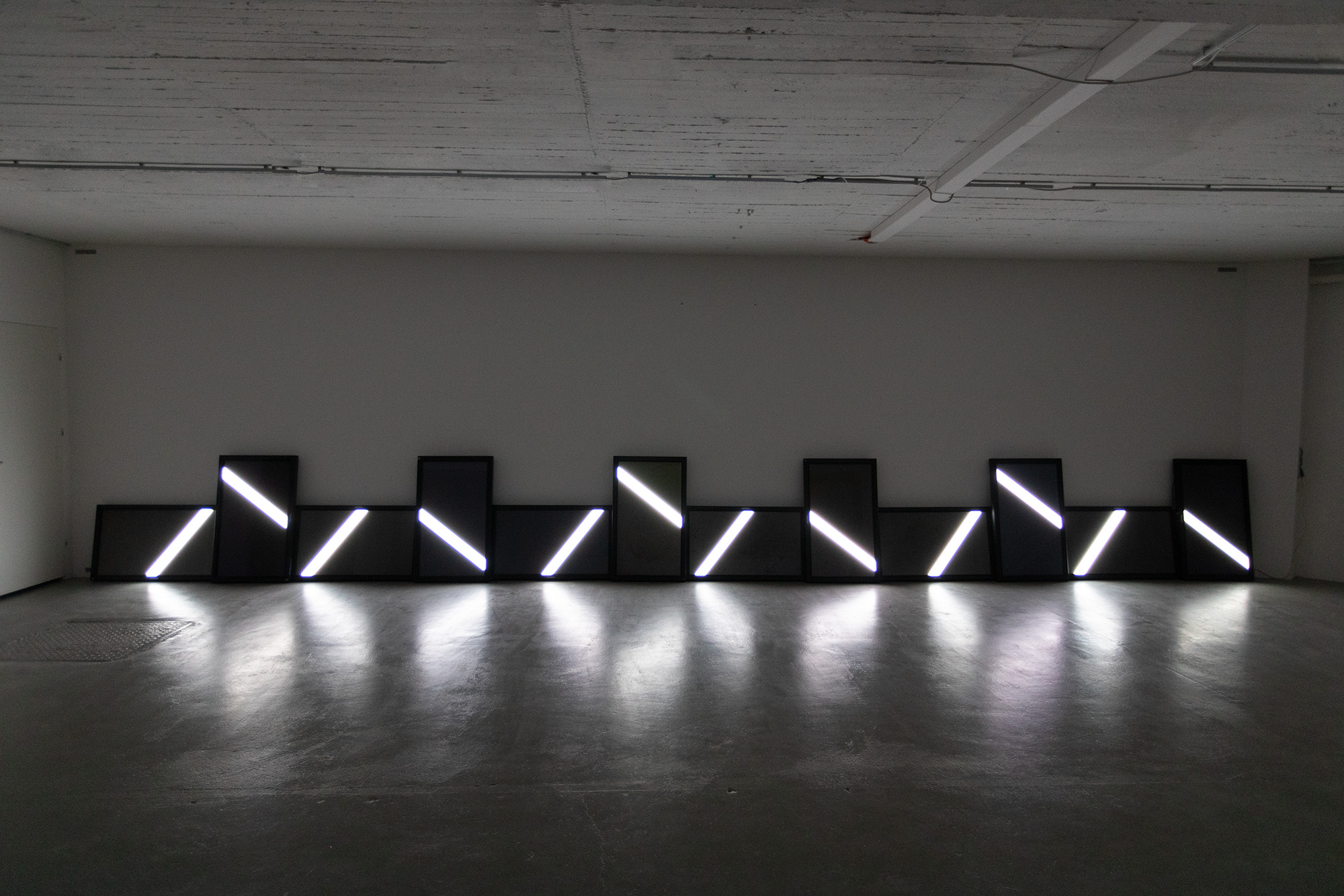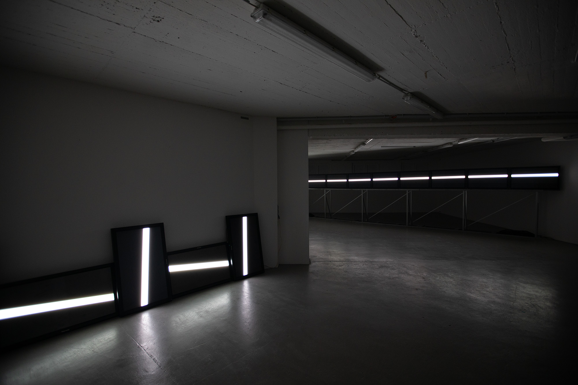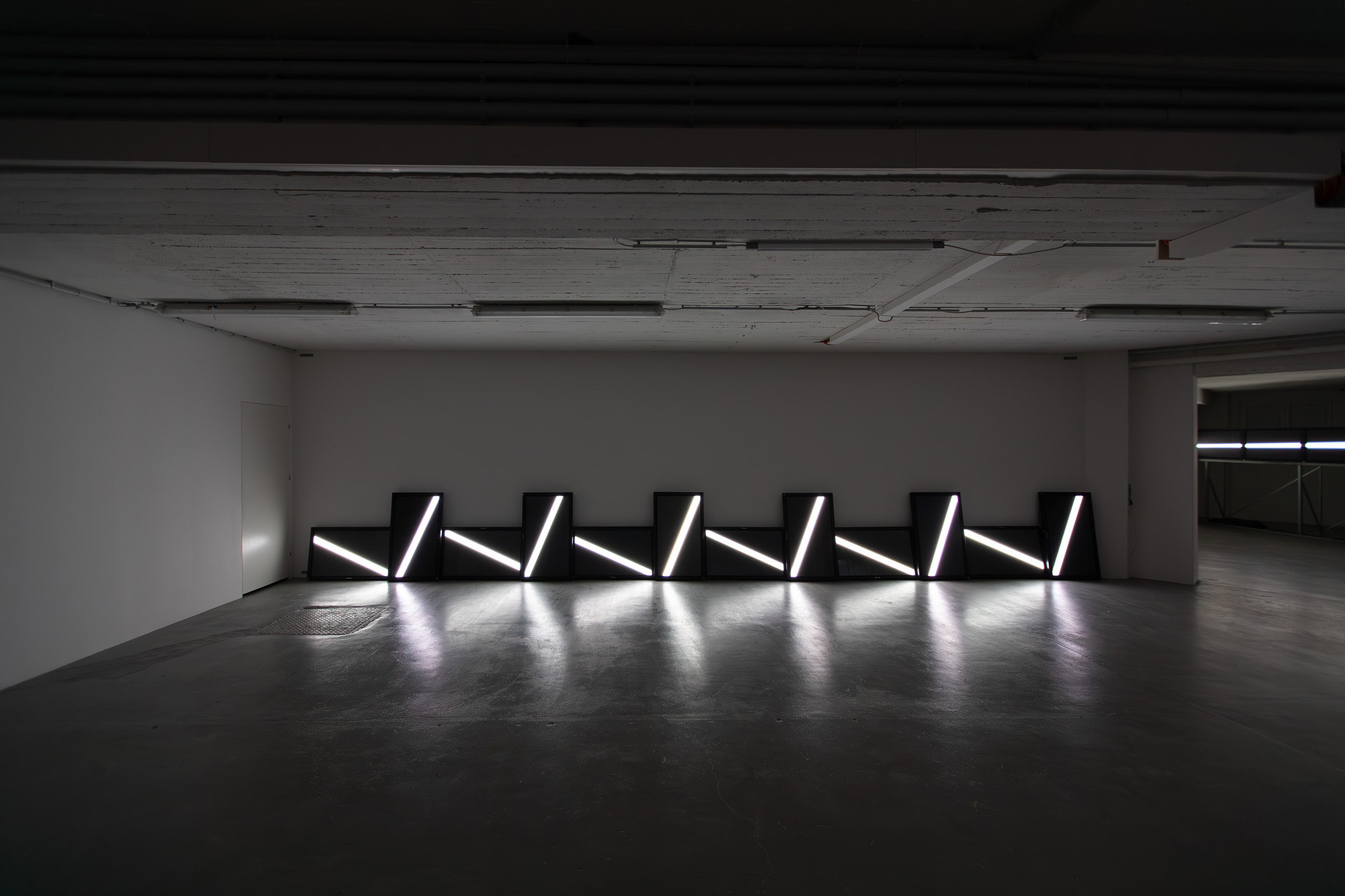 The UPPER EDGE – a line that fluctuates but does not disappear – is the horizon. It is stretched diagonally across the second room, angled towards the main hall, and is made up of nine monitors raised at eye level, showing a nine-channel synchronized video with a white fluctuating band.