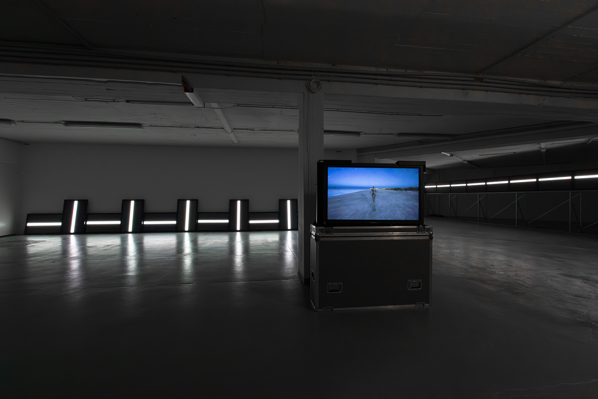 These two lines of multiple monitors are contrasted by the video KINBURN RUN, presented on a single monitor. The monitor shows a figure running along the shore, positioned so that the lines from the monitors on the left and right form a continuation of the landscape in the video.